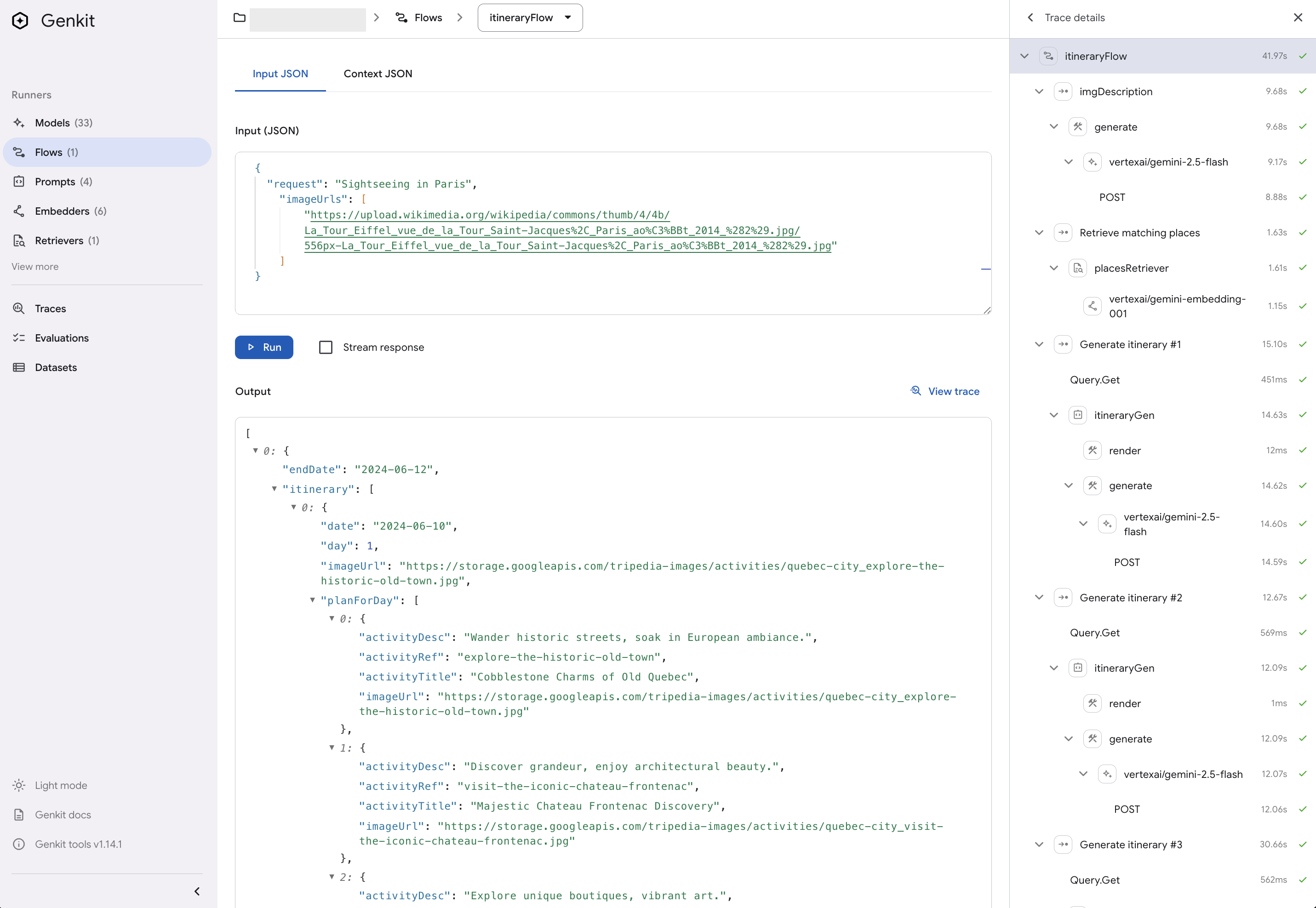 2. In the Genkit Developer UI, view a Genkit flow in the src/lib/genkit/itineraryFlow.ts file.