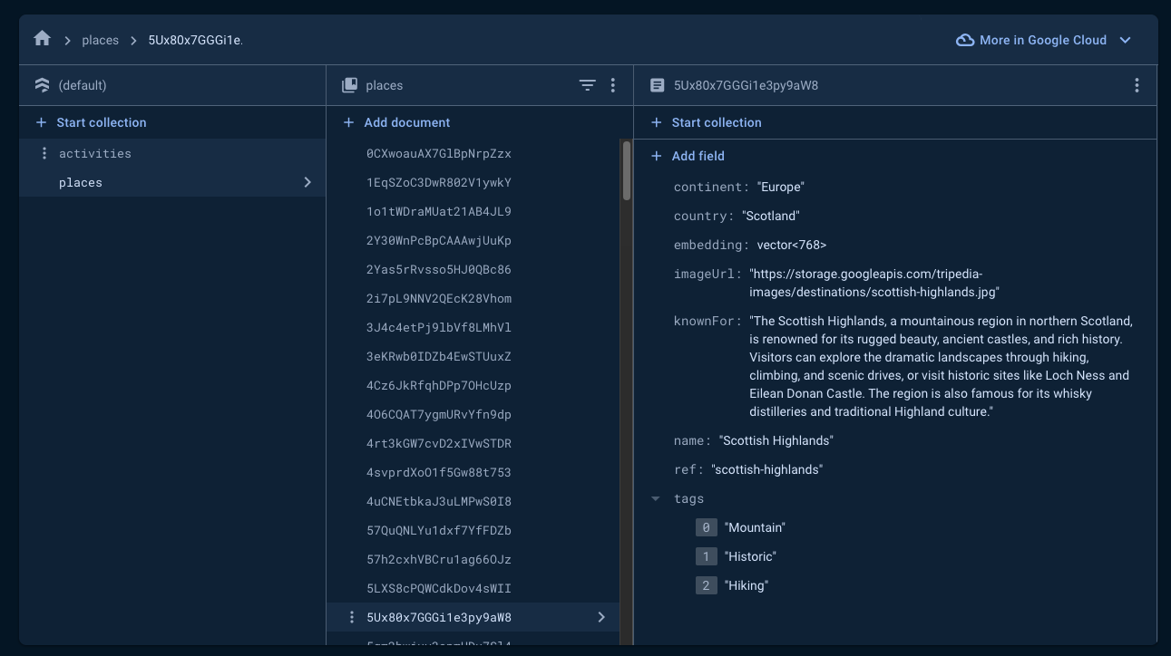 In a previous step of this codelab, you populated your Firestore database with sample places and activities. Each place entry includes a knownFor text field describing its notable attributes, along with a corresponding embedding field containing the vector representation of this description.