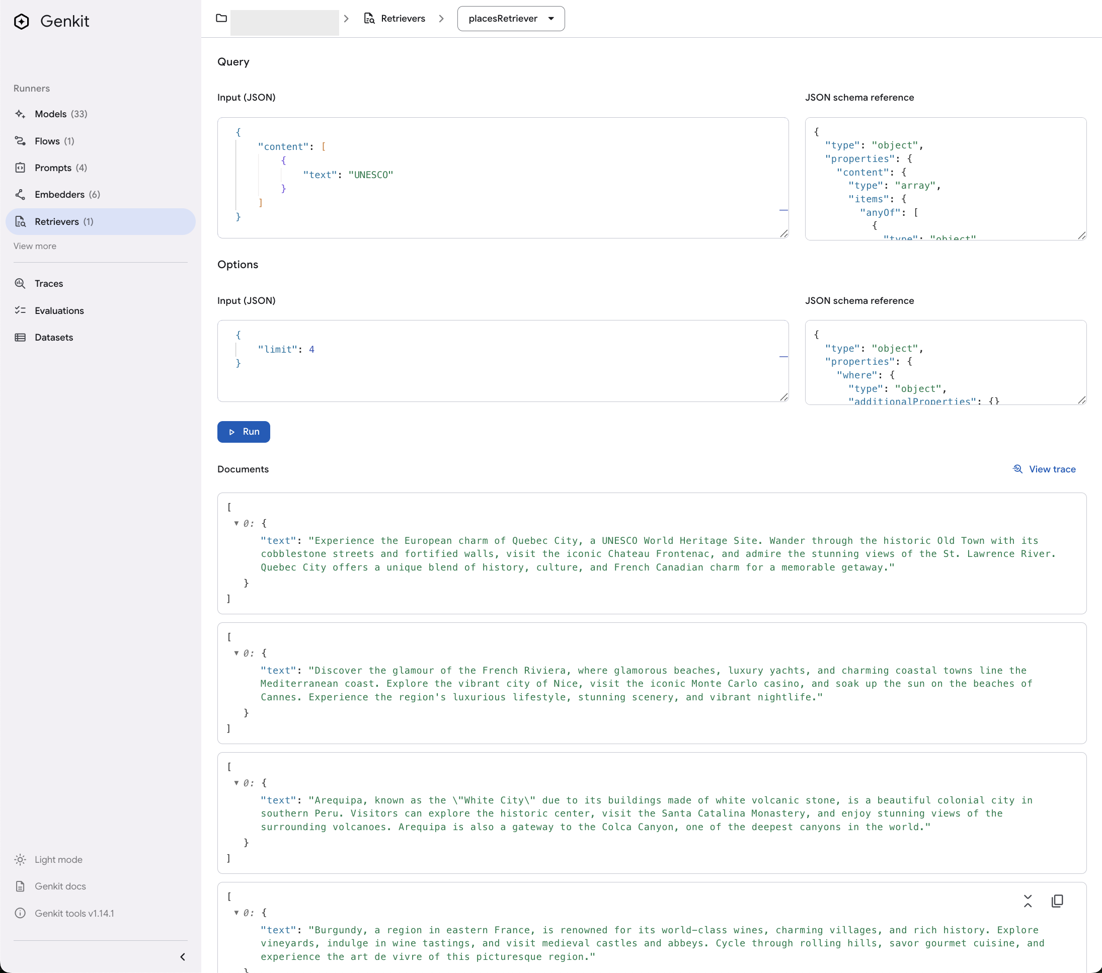 2. In the Genkit Developer UI, open the retrievers/placesRetriever.