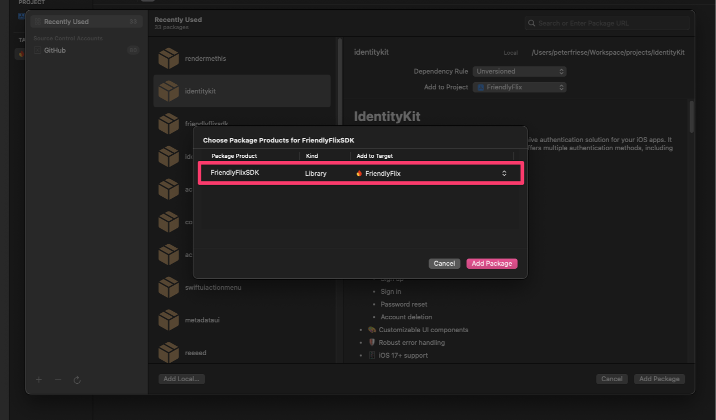 FriendlyFlix/appフォルダからFriendlyFlixSDKパッケージを追加します。 - Xcode がパッケージの依存関係を解決するまで待ちます。