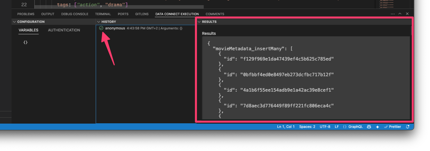 يمكنك الآن النقر على "تشغيل" (الإنتاج) في لوحة Firebase Data Connect، تمامًا كما فعلت مع المحاكيات المحلية، لإضافة بيانات إلى بيئة الإنتاج.