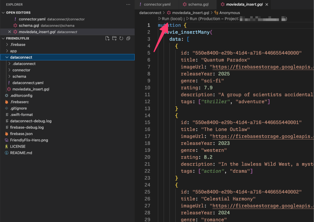 codelab-dataconnect-ios/FriendlyFlix目錄。 - 從 Visual Studio Code Marketplace 安裝 Firebase Data Connect 擴充功能。