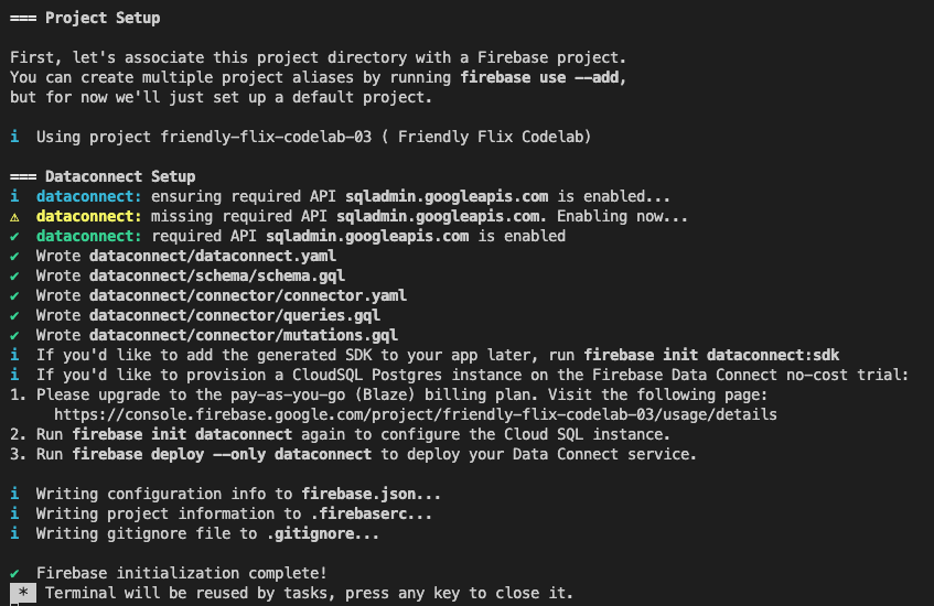 अहम जानकारी: अगर आपने अपने प्रोजेक्ट में पहली बार कोई स्कीमा डिप्लॉय किया है, तो इस प्रोसेस से Cloud SQL PostgreSQL इंस्टेंस बनेगा. इसमें करीब 15 मिनट लग सकते हैं. Cloud SQL इंस्टेंस के तैयार होने और Firebase Data Connect के साथ इंटिग्रेट होने तक, आपको डिप्लॉय करने की अनुमति नहीं मिलेगी.