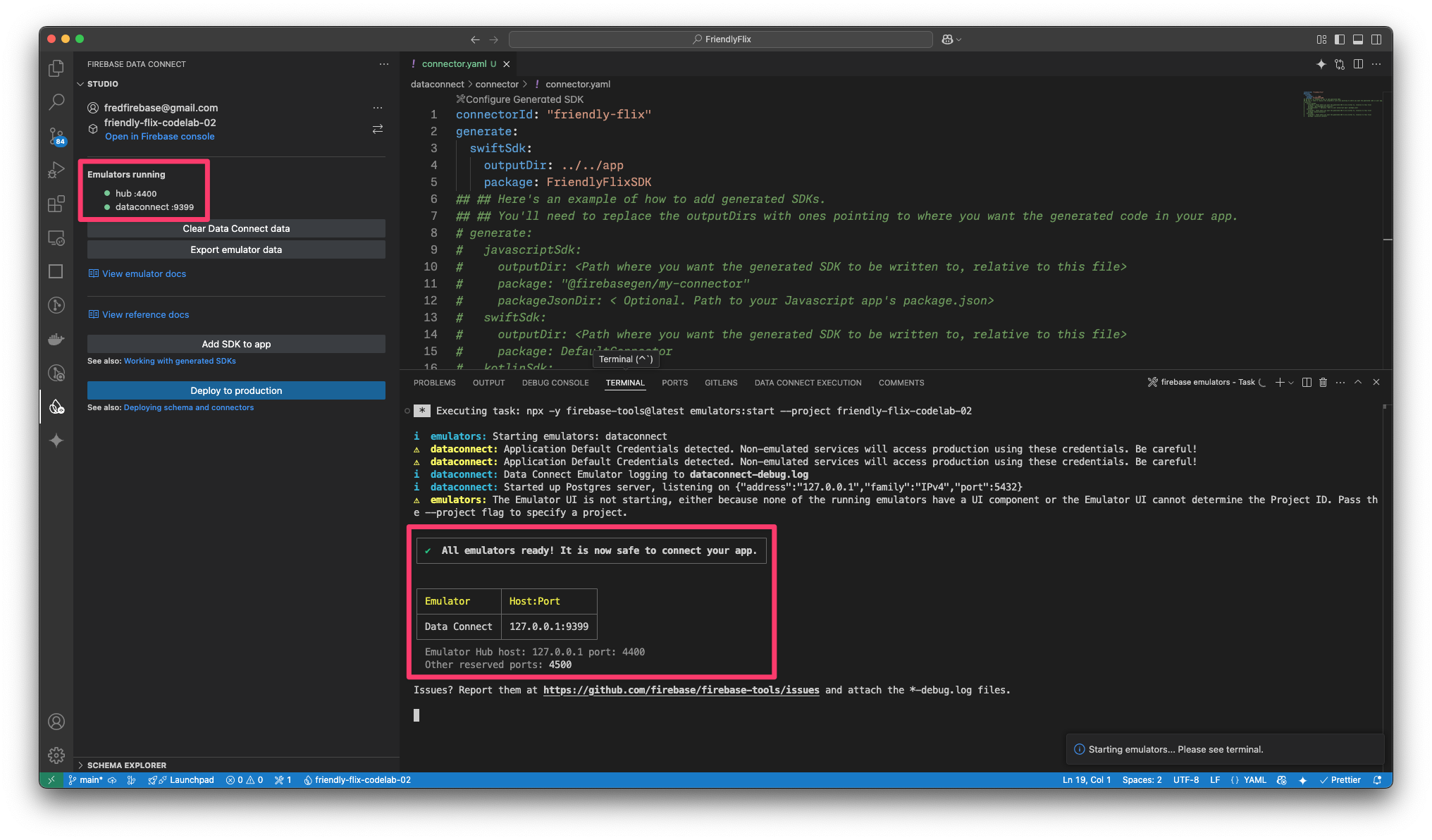 codelab-dataconnect-ios/FriendlyFlix ディレクトリで次のコマンドを実行します。