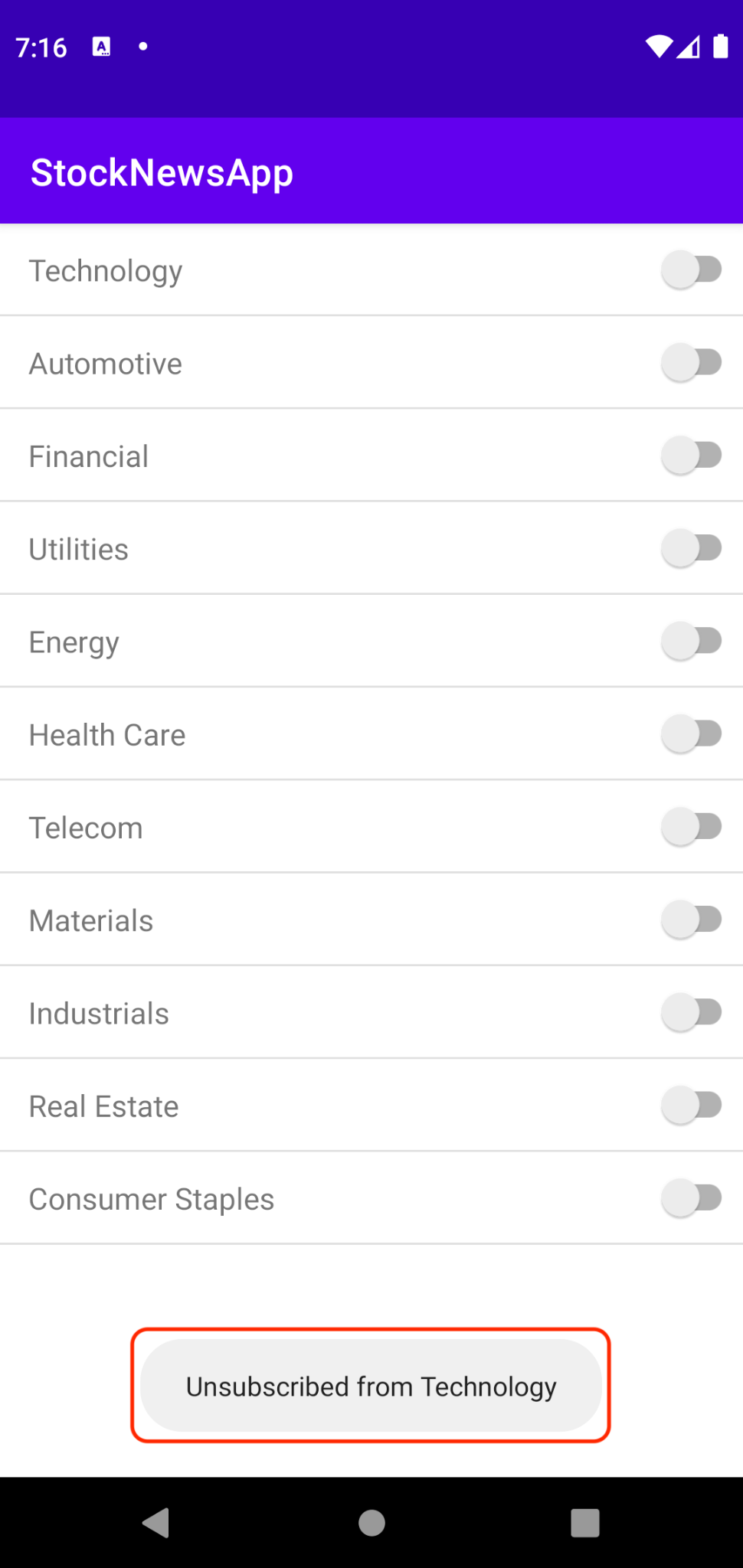 MainActivity.javaadds theRecyclerViewthat displays the Stock Category choices. SubscriptionAdapter.javaimplementsRecyclerView.Adapterwhich draws the Stock Category selection screen.- Each Stock Category has a name and a subscription toggle next to it.