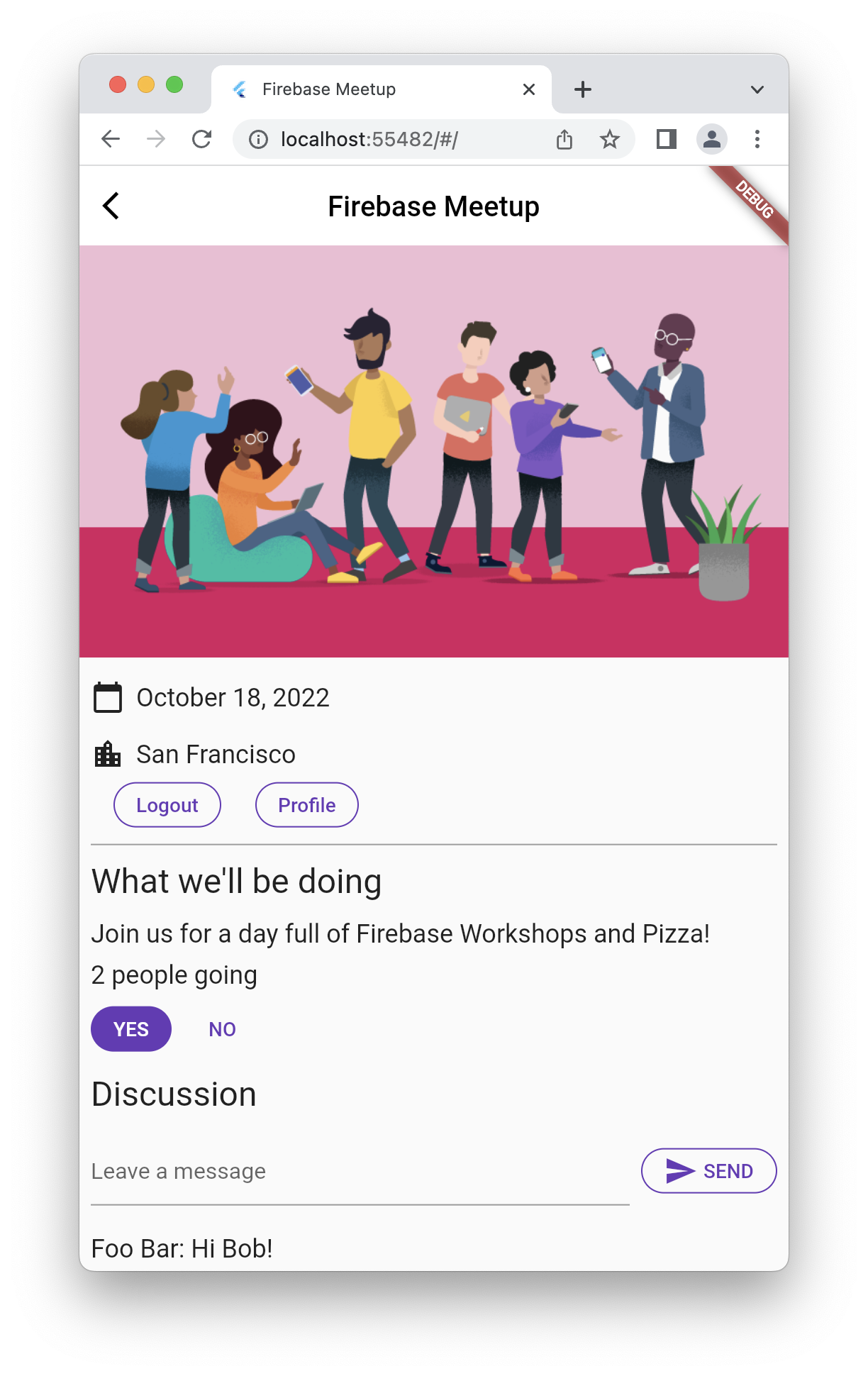 Şu anda uygulamanız yalnızca etkinlikle ilgilenen kullanıcıların sohbet etmesine izin veriyor. Ayrıca, birinin gelip gelmediğini yalnızca sohbetten öğrenebilirsiniz.