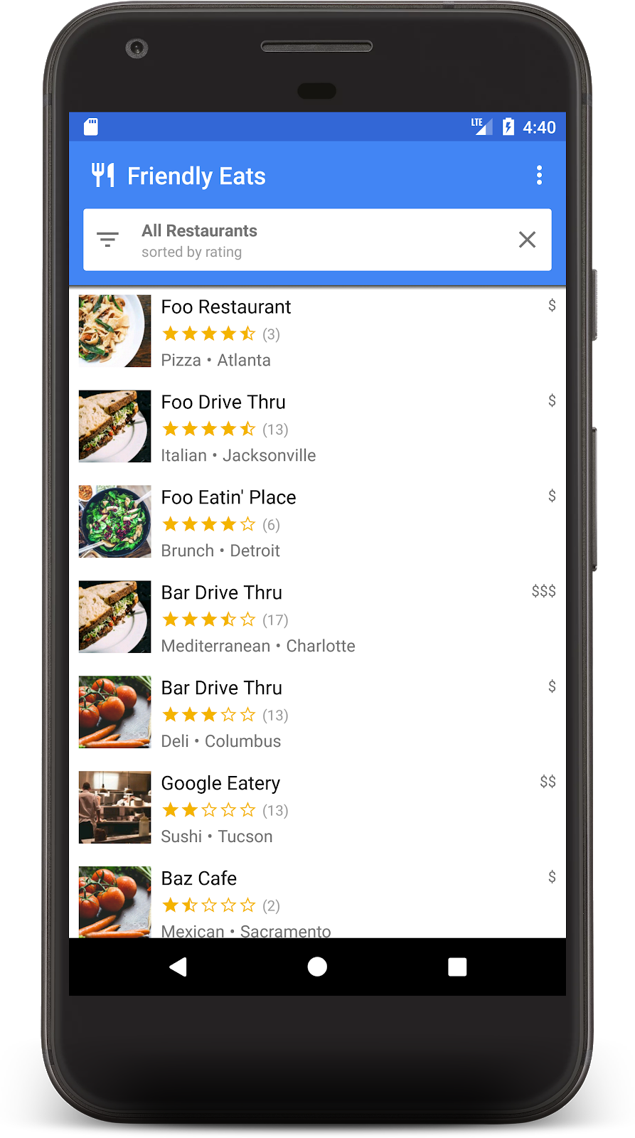 Głównym obiektem modelu w naszej aplikacji jest restauracja (patrz model/Restaurant.kt). Dane Firestore są podzielone na dokumenty, kolekcje i podkolekcje. Każda restauracja będzie przechowywana jako dokument w kolekcji najwyższego poziomu o nazwie "restaurants". Więcej informacji o modelu danych Firestore znajdziesz w dokumentacji.