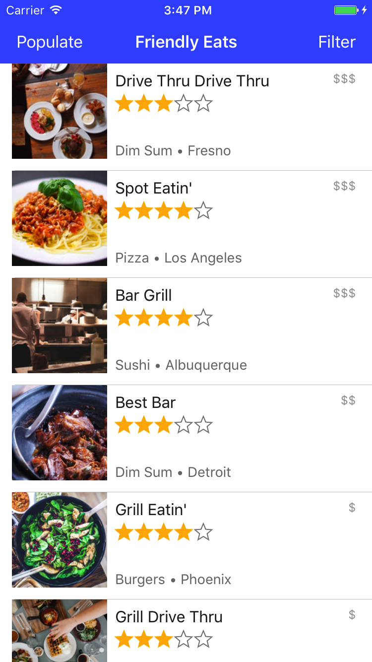 Uruchom ponownie aplikację i sprawdź, czy restauracje, które były wcześniej widoczne w konsoli, są teraz widoczne w symulatorze lub na urządzeniu. Jeśli udało Ci się ukończyć tę sekcję, Twoja aplikacja odczytuje i zapisuje dane w Cloud Firestore.