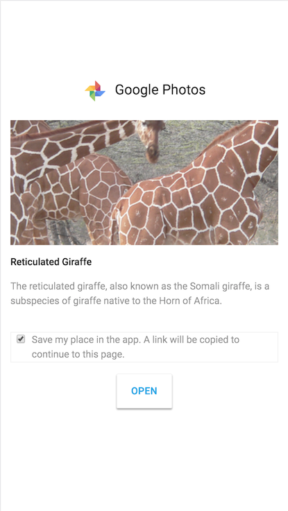 應用程式預覽頁面也能在 iOS 上接收Dynamic Links做為不重複的相符項目。使用者選取「在應用程式中儲存我的位置」,然後點選「開啟」後,Dynamic Link 就會複製到 iOS 剪貼簿。接著,當應用程式開啟時,Dynamic Links SDK 就能收到連結,並確信應用程式的目前使用者就是點選連結的使用者。