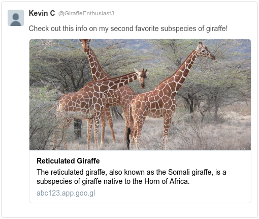 舉例來說,社群應用程式可以使用中繼資料,以資訊卡形式呈現共用的 Dynamic Links,並附上標題、連結內容的說明和預覽圖片。
