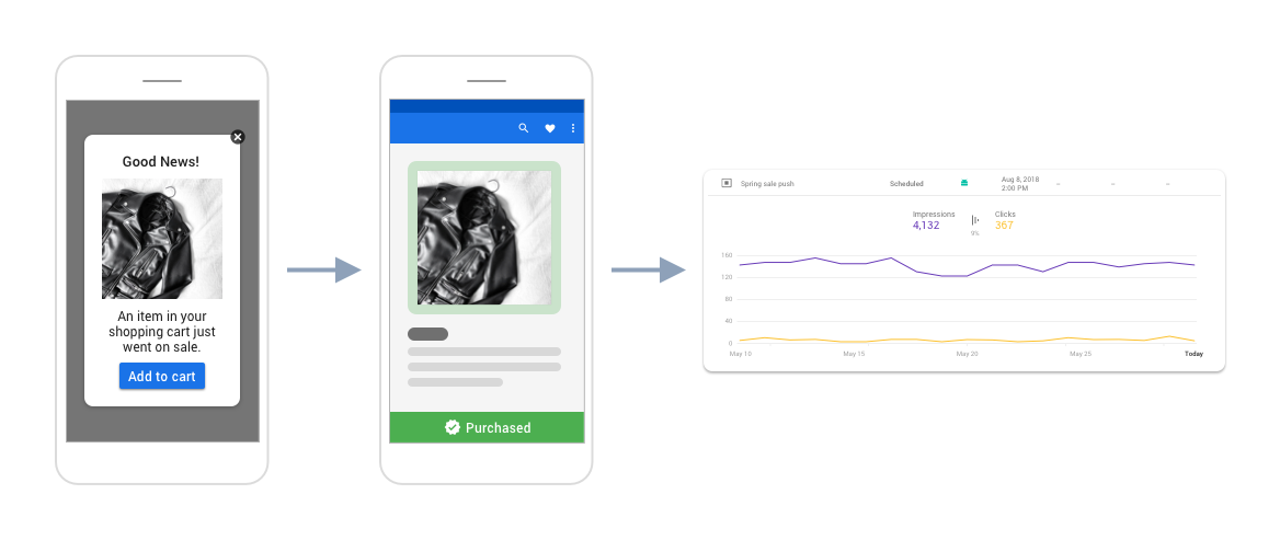 • Menawarkan pesan promosi dengan tombol tindakan template Modal untuk item diskon. Firebase memungkinkan Anda mengetahui berapa banyak pengguna yang menerima pesan, berapa banyak yang mengkliknya, dan berapa banyak peristiwa konversi yang diselesaikan, seperti pembelian e-commerce.