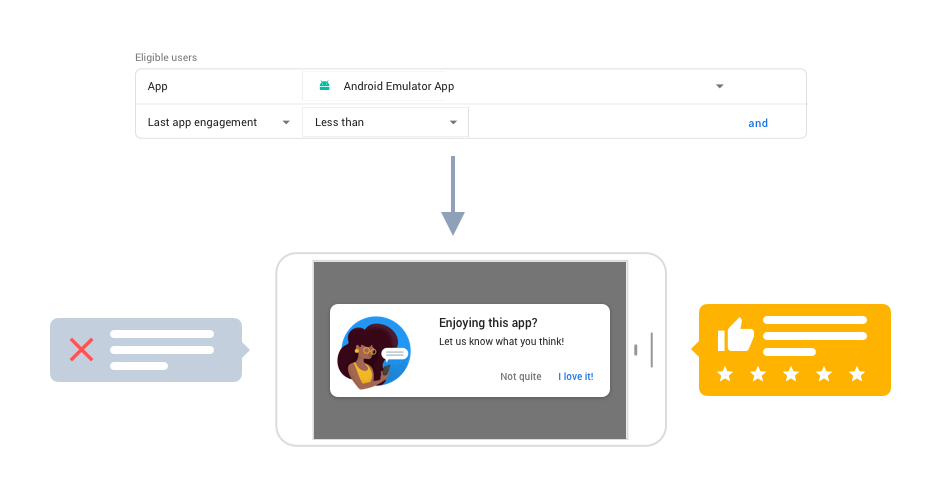 - استهدِف المستخدمين الذين سجّلوا آخر تفاعل مع التطبيق بين يوم واحد وسبعة أيام للتأكّد من أنّهم نشطون. اسأل المستخدمين المتفاعلين عمّا إذا كانوا يستمتعون بتطبيقك. واستنادًا إلى إجاباتهم، استخدِم رابطًا ذكيًا لتوجيههم إلى Google Play لكتابة مراجعة أو إلى استطلاع لجمع الملاحظات.