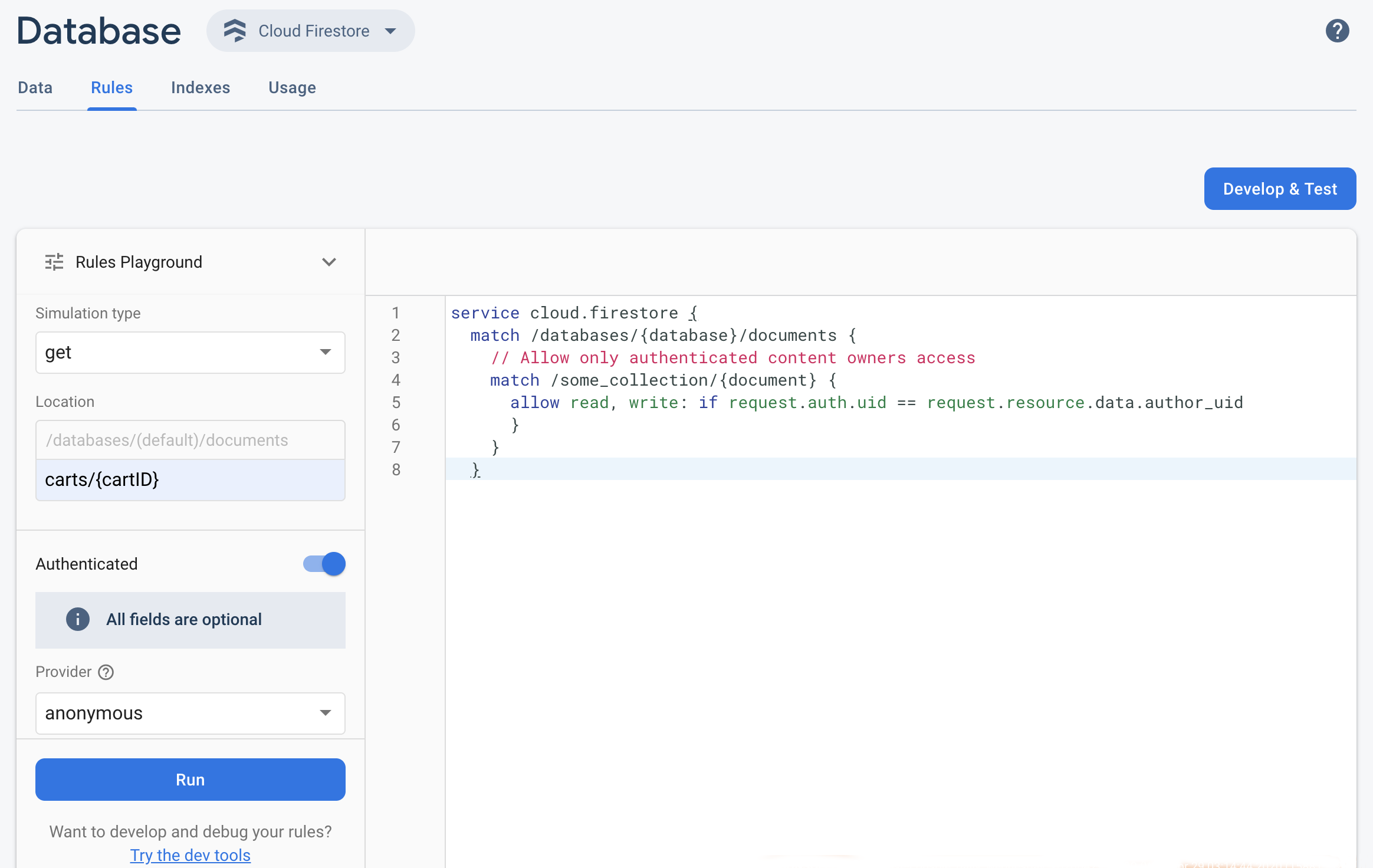 Wenn Sie die aktualisierten Firebase Security Rules in der Firebase-Konsole schnell testen möchten, verwenden Sie den Regel-Playground.